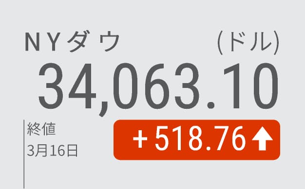 【NQNニューヨーク=張間正義】16日の米株式市場でダウ工業株30種平均は3日続伸し、前日比518ドル76セント(1.5%)高の3万4063ドル10セントで終えた。ウクライナとロシアの停戦交渉や中国政府による景気刺激策への期待が強まり、景気敏感株を中心に買いが優勢だった。午後2時に米連邦準備理事会(FRB)が米連邦公開市場委員会(FOMC)の結果を発表すると、利上げ加速を警戒した売りでダウ平均は下げに転じる場面もあり、相場は乱高下した。