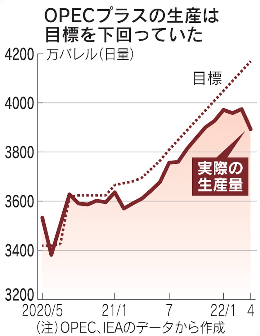 もっとも、ウクライナ侵攻による制裁で落ち込んだロシアの生産減を補うには十分とはいえない。国際エネルギー機関(IEA)によると、4月のロシアの生産量は計画に対し日量134万バレルの未達だった。欧州連合(EU)が5月末に合意したロシア産石油の禁輸など米欧日の制裁が続く限り、回復は見込みにくい。アフリカの産油国なども生産目標割れが続いている。
