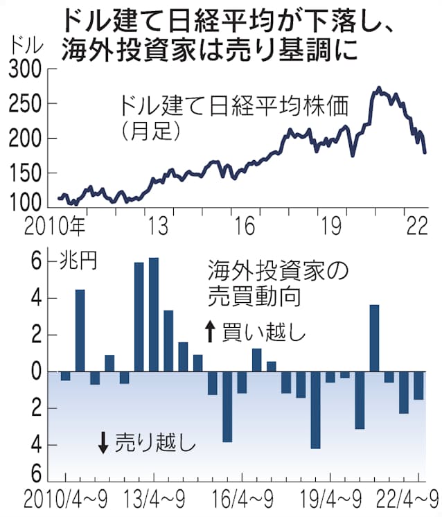 円安の業績の押し上げ効果をかつてほど期待しにくいなか、海外投資家はドル建てで見たときの日本株の価値の目減りを警戒している。22年4~9月にドル建て日経平均株価は約2割下落し、半期ベースの下落率としては10年以降で最大になった。