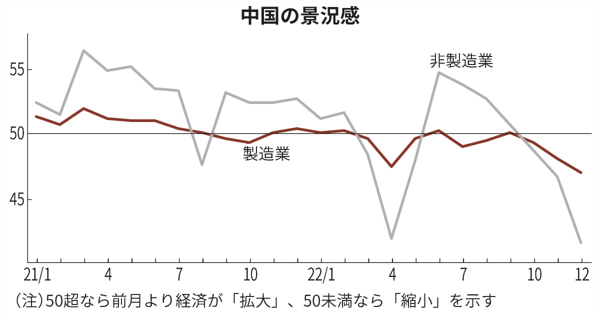 中国の景況感悪化、12月は3カ月連続50割れ 感染拡大で - 日本経済新聞