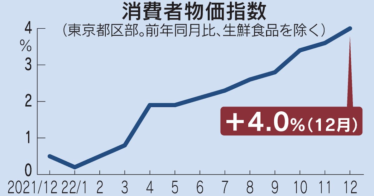 東京都区部の消費者物価指数4.0%上昇 22年12月、40年8カ月ぶり - 日本経済新聞