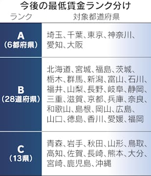 現行の目安額は各都道府県をA〜Dの4つのランクに分けて示す。東京都や大阪府などがA、沖縄県や高知県などがDとなっており、目安額はAからDにかけて低くなるのが通例で、都市部と地方の最低賃金の差が広がる要因になっている。