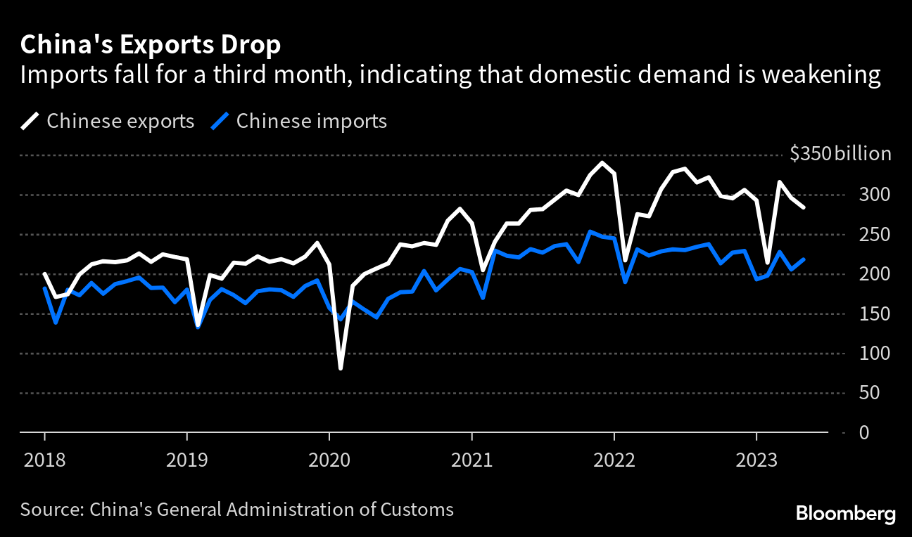 中国の輸出は5月に3カ月ぶりの減少となった。予想を上回る落ち込みで、外需減速に伴って中国経済のリスクは増している。