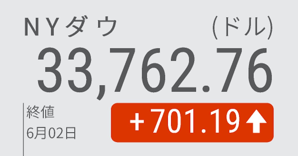 NYダウ続伸、701ドル高 デフォルト回避や雇用統計受け - 日本経済新聞